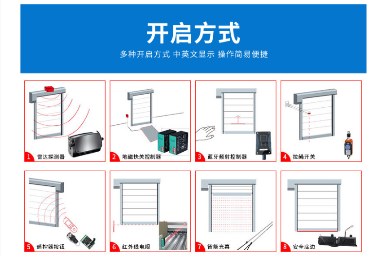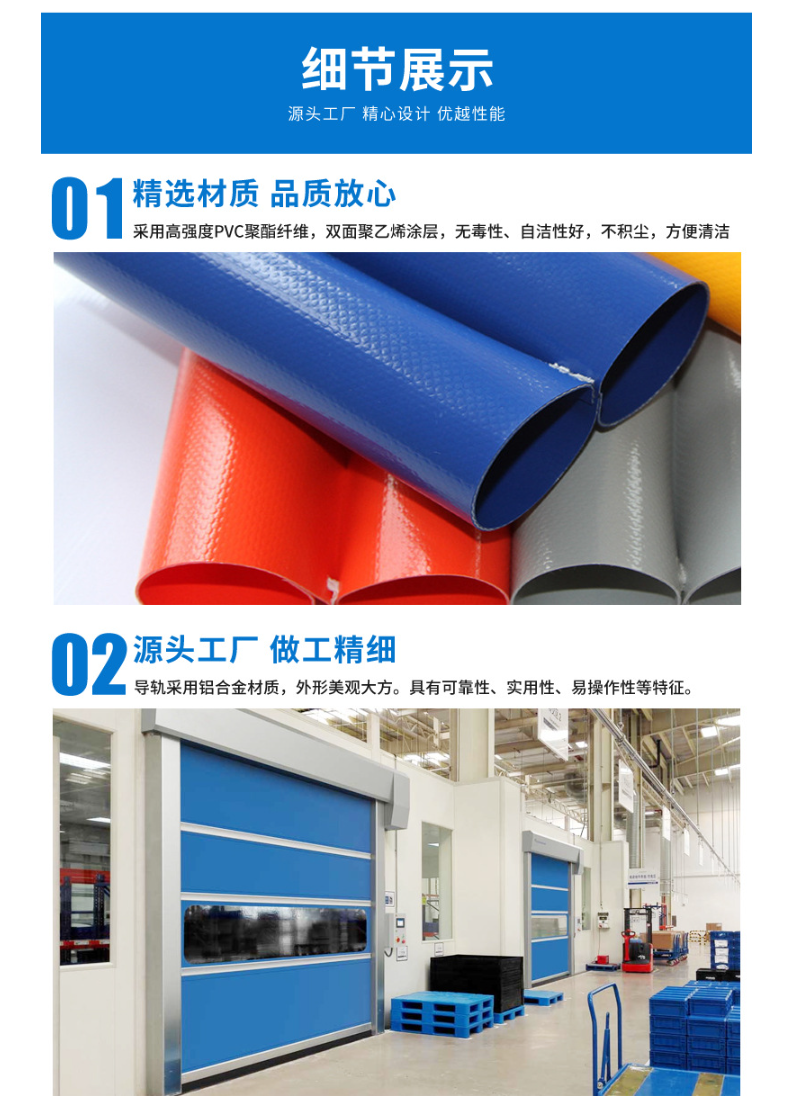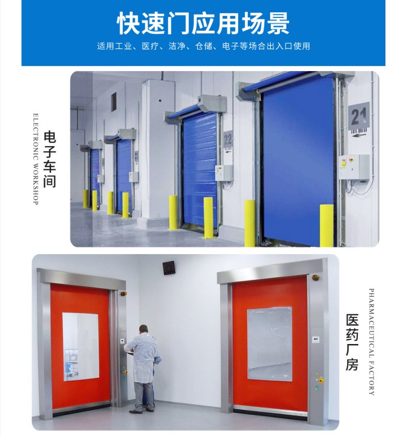 Pvc快速门,是指每秒运行速度在0.5-1.5米的门,是快速卷帘的无障碍隔离门,主要作用是快速隔离,从而保证车间空气质量无尘等级。具有保温、保冷、防虫、防风、防尘、隔音、防火、防异味、采光等多项功能,并广泛用于食品、化学、纺织、电子、超市、冷冻、物流、仓储等多种场所,可极高的满足高性能物流及洁净场所,并且节省能源,高速自动关闭,提高作业效率,创造更佳的作业环境等优点。