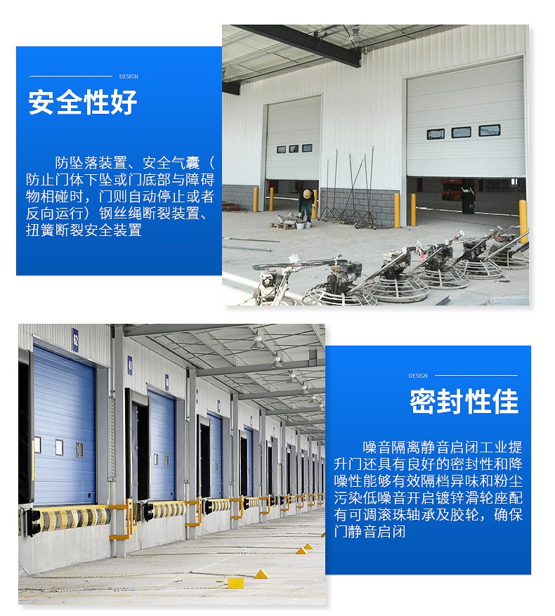 工业滑升门和工业提升门同属于工业门系列,工业滑升门也称为自动滑升门,电动滑升门等,工业滑升门门体厚度为40-50mm,工业提升门能适合每一种建筑物外用的门。适用于医药、食品、电子、印刷、超市等洁净度要求高的厂房及区域隔离,具有外形美观、高强度、安全可靠、开启平稳、低噪音、密封与保温性能良好、节省占用厂房空间及提高生产效率等显著特征,因较低的安装条件和较高的实用性而得到广泛应用。