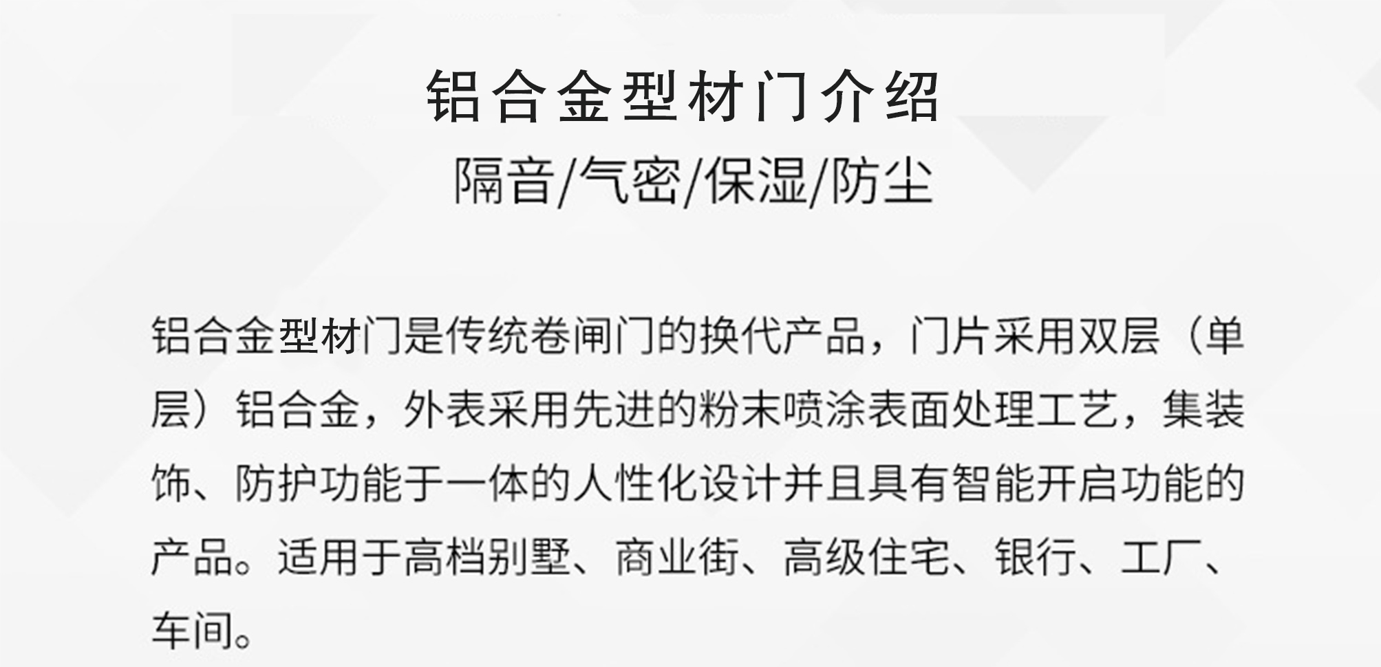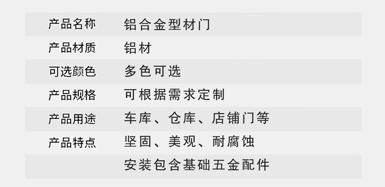 铝合金型材门应用:广泛应用于商铺 车库 别墅 市场 仓库和工业厂房等
